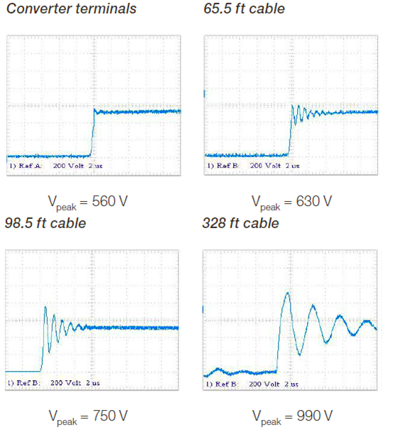 Tín hiệu truyền đến động cơ thông qua dây dẫn bị phản xạ một phần, gây nên quá áp, bởi vì trở kháng tần số cao của động cơ cao hơn trở kháng của dây dẫn. Dây dẫn quá dài sẽ gây ra quá áp tại cực đấu dây của động cơ. Mức quá áp cũng phụ thuộc vào loại dây dẫn. Dưới đây là hình ảnh minh họa điện áp đo được tại cực đấu dây biến tần (dây dẫn 0 feet) và điện áp đo tại cực đấu dây động cơ điện (tương ứng với các chiều dài dây dẫn khác nhau: 65.5ft, 98.5ft và 328ft)