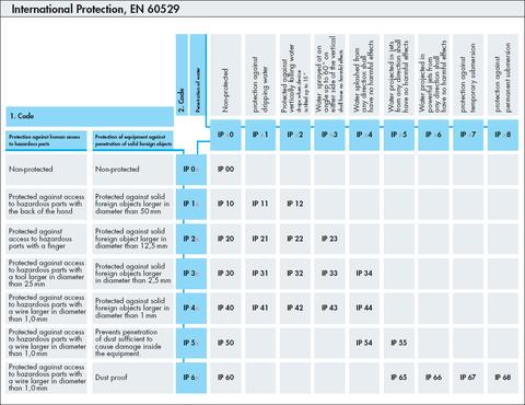 Cấu trúc của cấp bảo vệ IP ví dụ IP54 gồm: IP và 2 chữ số. Chữ số thứ nhất (5) nói lên độ bảo vệ chống bụi thâm nhập, chữ số thứ 2 (4) nói lên độ bảo vệ chống sự thâm nhập từ nước.