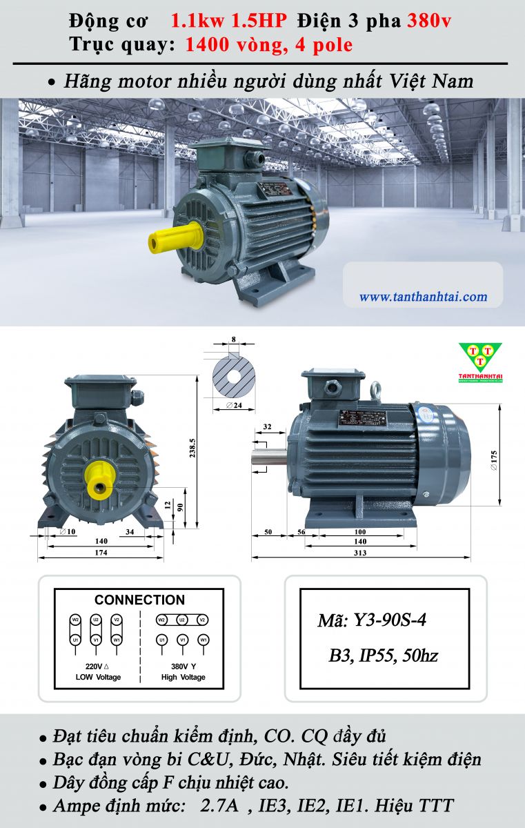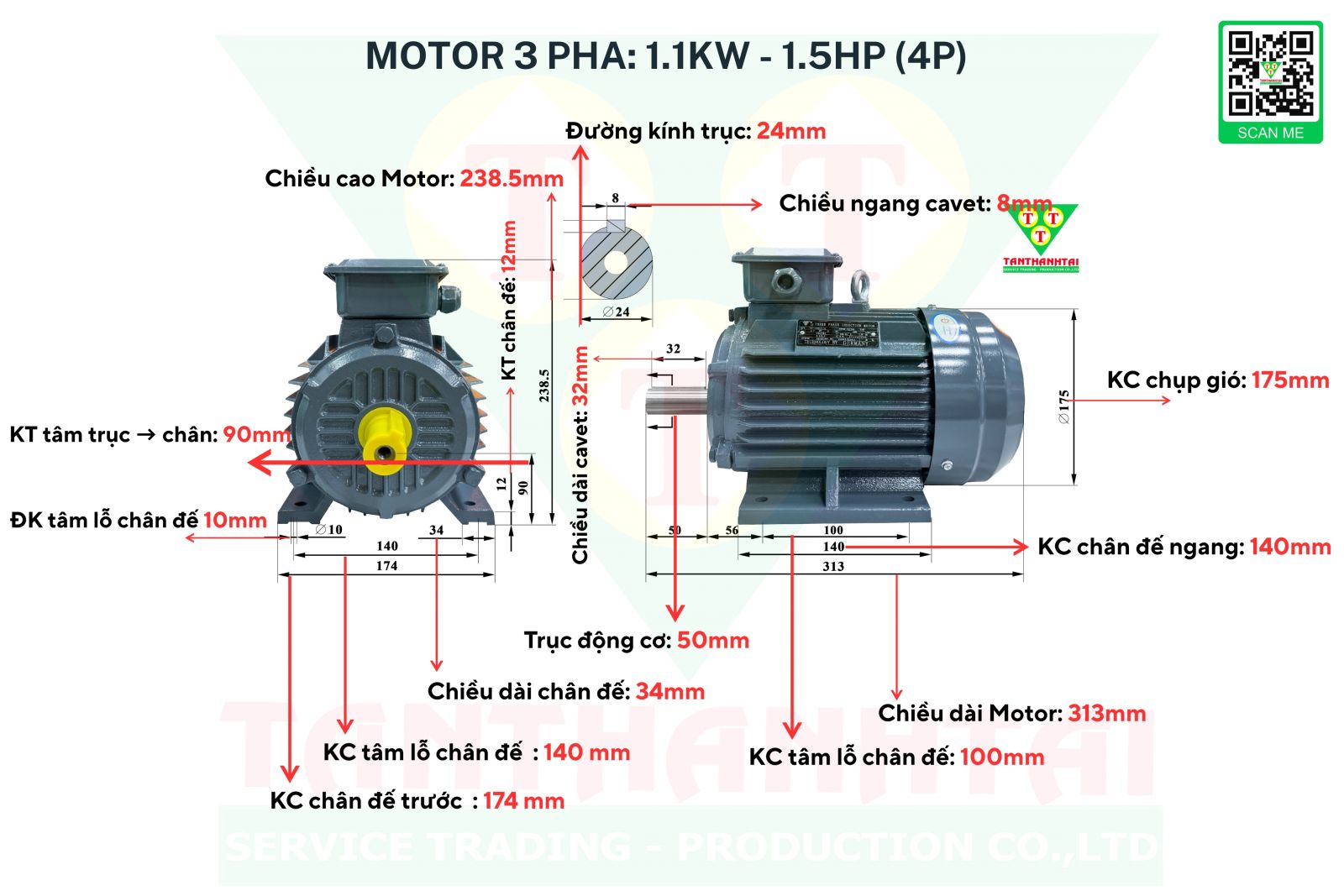 Động cơ điện 1.1kW - 1.5HP 3 Pha 380V 4 Cực điện - Motor Tân Thành Tài