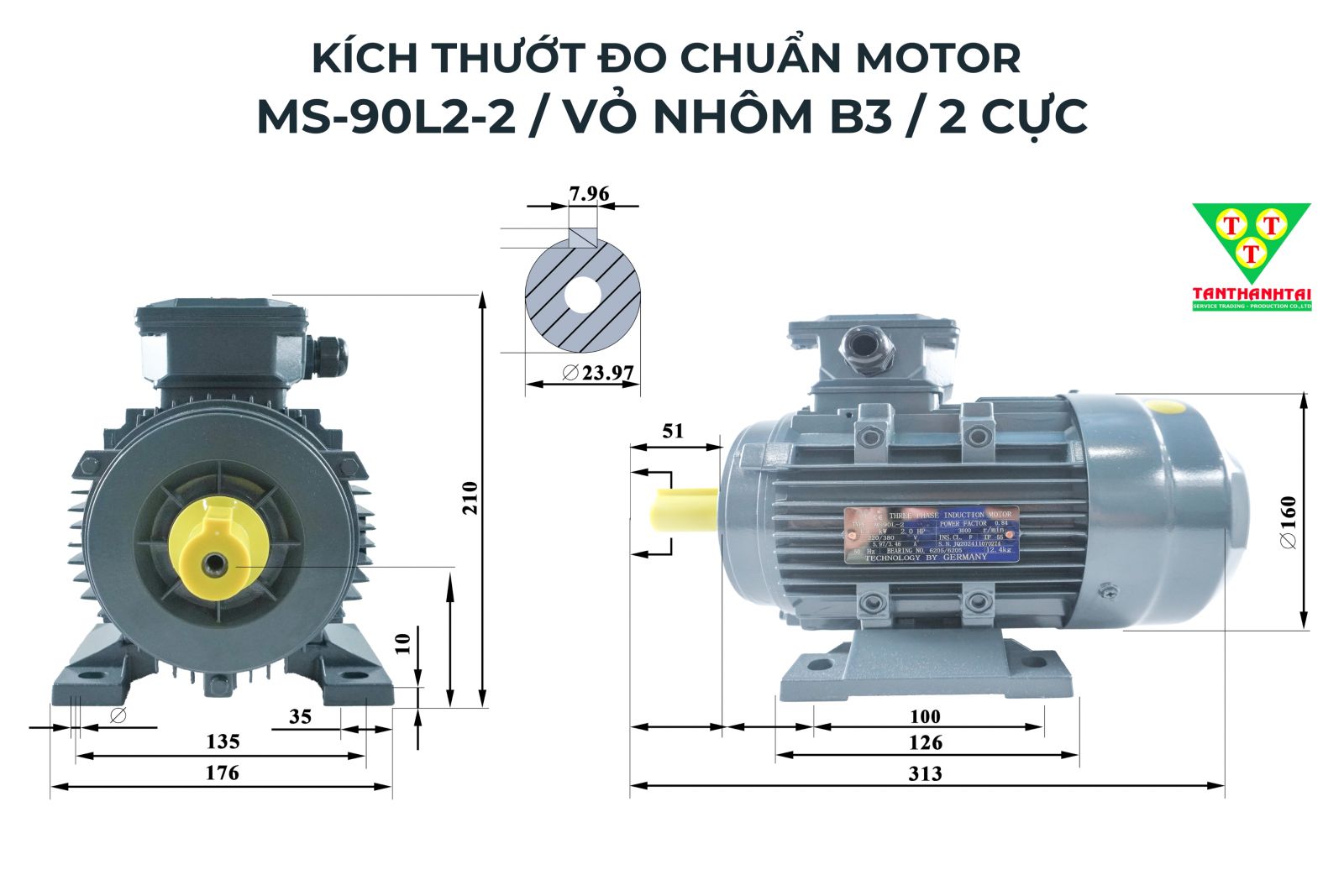 5. Thông số kích thướt chi tiết Motor 1.5 kW - 2 HP 3 Pha 380V 2 Cực điện - Vỏ nhôm