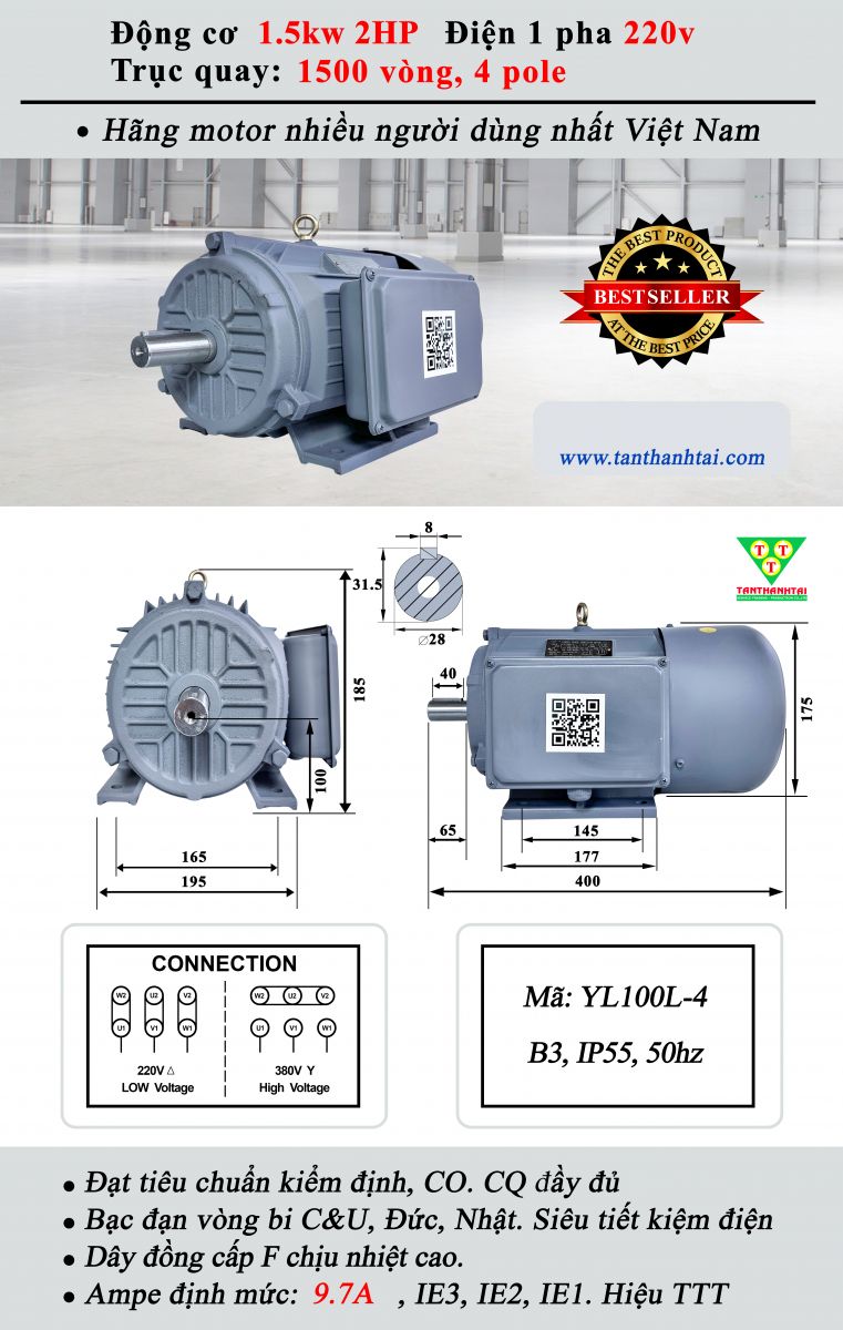 Động cơ điện 1.5kW – 2HP – 1 pha 220V – 1500 vòng/phút (4 cực) | Motor Tân Thành Tài