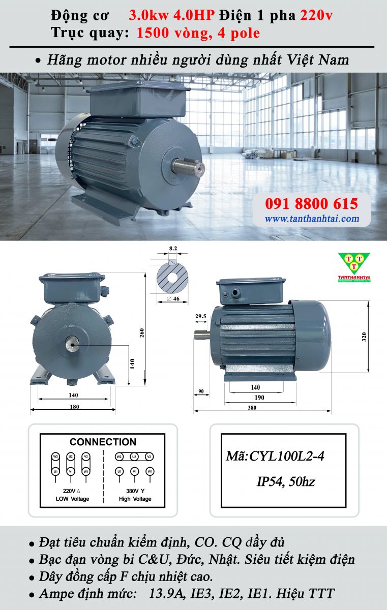 Motor 1 Pha 4HP (3.0kW) 220V – CYL100L2-4 – Khởi Động Mạnh, Kéo Tải Nặng | Tân Thành Tài