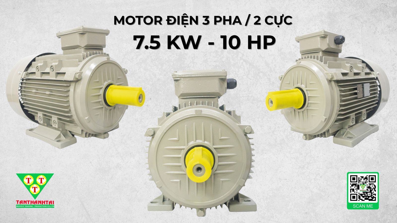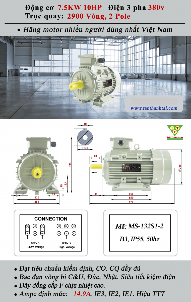 - Động cơ điện 7.5 kW - 10 HP 3 Pha 380V 2 Cực điện - Vỏ nhôm là dòng motor phổ biến nhất hiện nay được ứng dụng rộng rãi trong nhiều lĩnh vực sản xuất, công nghiệp và dân dụng. Đây là sản phẩm thuộc thương hiệu Tân Thành Tài (TTT) – đơn vị được nhiều khách hàng tin tưởng và lựa chọn tại Việt Nam.