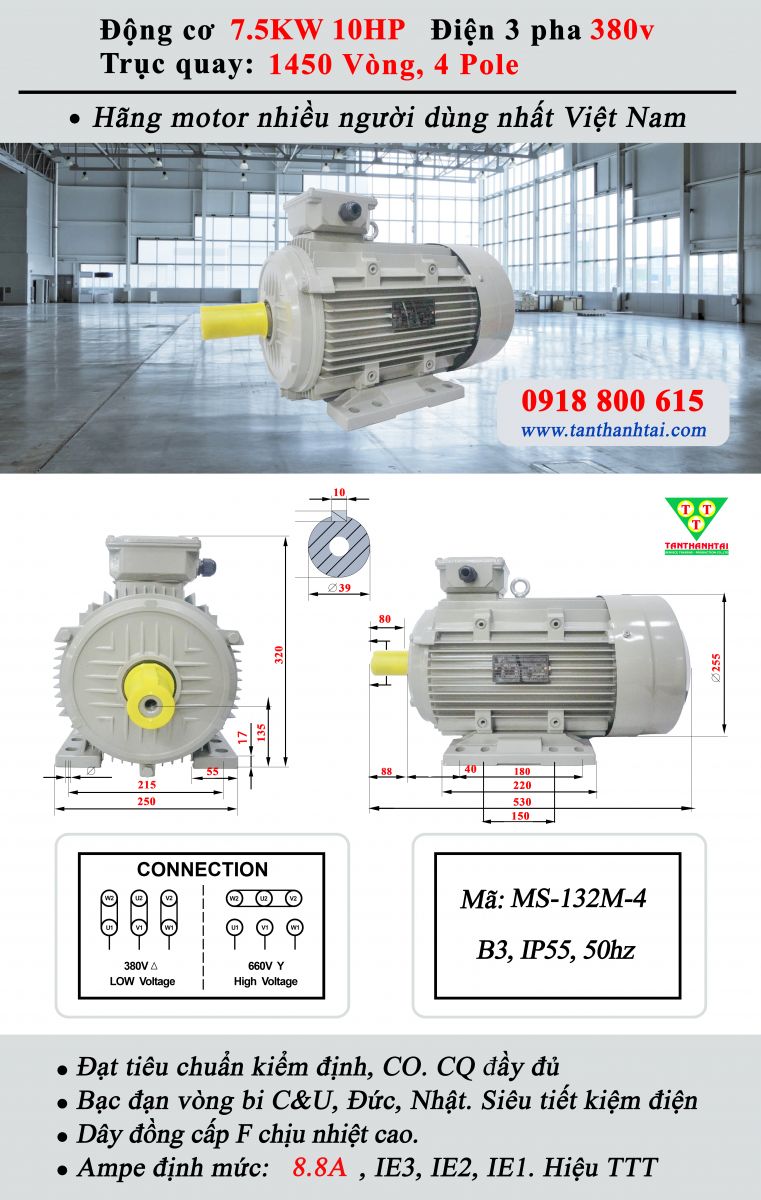 5. Thông số kích thướt chi tiết động cơ 7.5 kW - 10 HP 3 Pha 380V 4 Cực điện