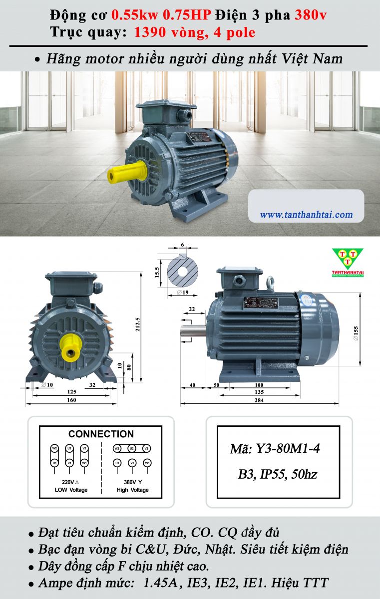 Động cơ điện 0.55kW (0.75HP) 3 Pha 380V – Motor Tân Thành Tài