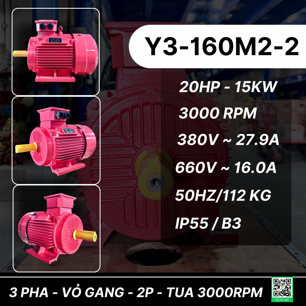 Motor điện 15kW 20HP 3 pha 380V 2 cực (2P) tốc độ 3000 vòng/phút là dòng động cơ công suất trung bình, tốc độ cao, được ứng dụng phổ biến trong nhiều ngành công nghiệp. Với công nghệ sản xuất theo tiêu chuẩn Đức – Nhật, sản phẩm mang đến hiệu suất vượt trội, độ bền cao và khả năng tiết kiệm điện năng, đáp ứng nhu cầu vận hành liên tục trong môi trường làm việc khắc nghiệt.