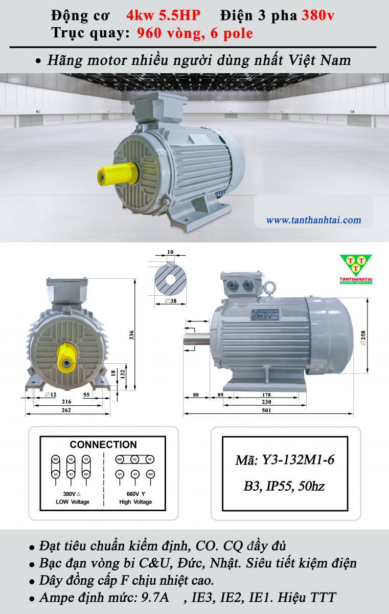 Sản phẩm mang mã Y3-132M1-6, lắp đặt chân đế B3, đạt chuẩn IP55, sử dụng điện áp 380V – 50Hz, được phân phối chính hãng bởi Tân Thành Tài – đơn vị chuyên cung cấp motor công nghiệp uy tín tại Việt Nam.